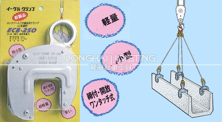 ? ECB型鷹牌混凝土夾具、混凝土制品夾鉗日本鷹牌EAGLE CLAMP品牌產品,煙臺開發區龍海起重工具有限公司銷售。