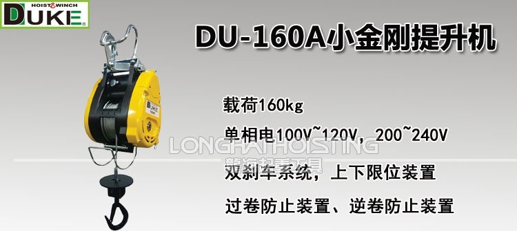 ? 煙臺(tái)開發(fā)區(qū)龍海起重工具有限公司銷售臺(tái)灣DUKE小金剛提升機(jī):DU-160A小金剛提升機(jī),載荷160kg,外型小巧,重量輕,凡起重、揚(yáng)升、拖拉等作業(yè)皆適宜,省時(shí)省力效率高。
